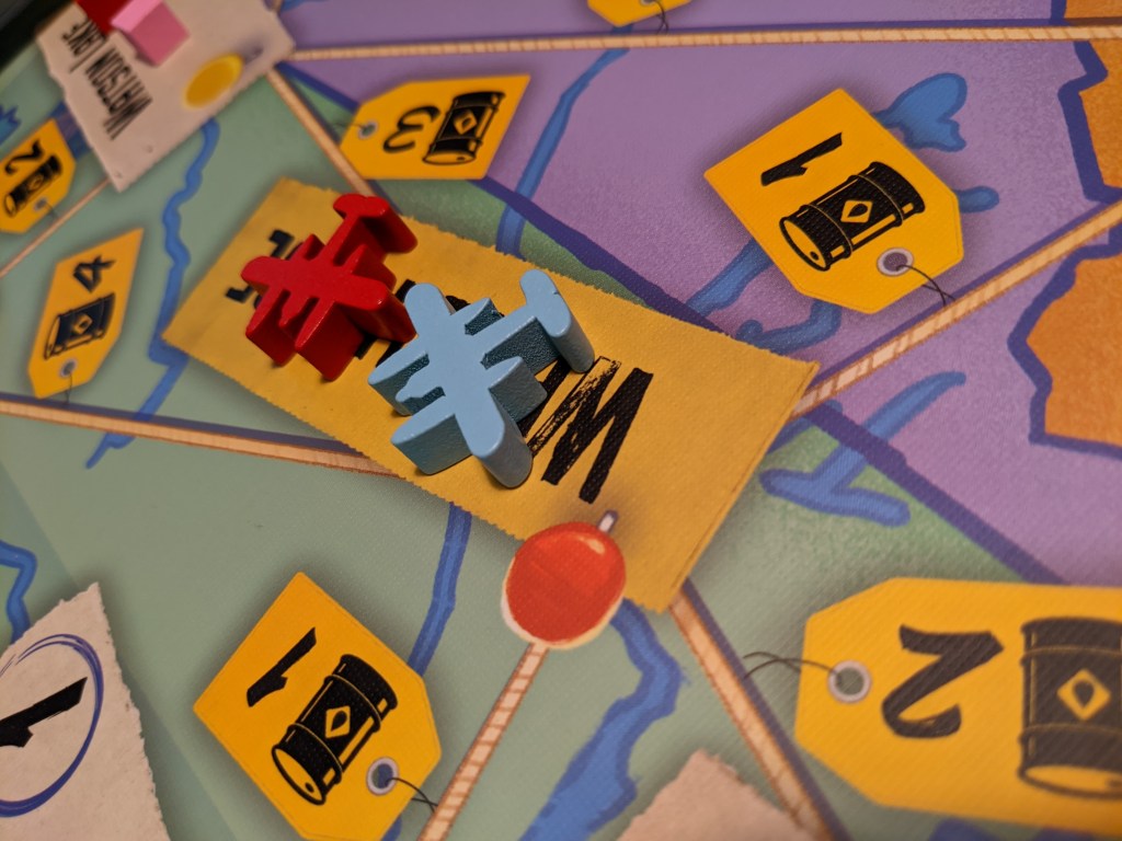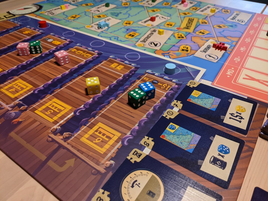 Jede Runde besteht aus insgesamt 4 Phasen. In der ersten, der Boardingphase, entscheiden sich die Spielerinnen reihum beginnend bei der Startspielerin für einen der 6 Flugstege. An diesen warten die Passagierwürfel auf uns, doch können wir in der Regel nur Würfel derselben Farbe vom selben Steg boarden. Zusätzlich bietet jeder Steg noch einen Bonus, der sofort ausgeführt werden darf, zum Beispiel, dass dieses Mal auch 2 Würfel unterschiedlicher Farbe aufgenommen werden dürfen. Der oberste Steg besitzt keinen Bonus, hat man sich mit dessen Auswahl doch den Startspielervorteil bis zur nächsten Boardingphase gesichert, ansonsten wird die Spielerin auf dem nächstgelegenen Steg zur Startspielerin. Zum Schluss der Phase müssen wir noch unsere Treibstoffanzeige entsprechend der Passagieranzahl anpassen. Unsere Flieger bieten insgesamt Platz für bis zu vier Passagiere, doch für jeden Passagier können wir entsprechend weniger Treibstoff zu Beginn der Runde laden, wodurch wir eventuell nicht ans gewünschte Ziel kommen. Dann folgt auch schon die Flugphase. Durch Ausspielen von Ticketkarten befördern wir jeweils einen Passagier an den jeweiligen Ort, dabei können auch 3 beliebige Karten abgeworfen und als Joker verwendet werden. Durch Ausspielen weiterer Karten mit demselben Bonussymbol können eben jene Boni freigeschaltet werden, die zusätzliches Geld oder Treibstoff bringen, beziehungswiese eine Verbesserung am Flieger erlauben. Natürlich muss auch entsprechend genug Treibstoff vorhanden sein, um zum jeweiligen Zielort zu gelangen, was sowohl auf dem Spielbrett als auch auf den Karten selber abgedruckt ist. Wird ein Passagierwürfel erfolgreich an seine Wunschdestination befördert, erhält die Spielerin als Belohnung einen Holzwürfel als Ortsmarker, welchen er auf der Miniaturkarte auf seinem Spielertableauf ablegt. Stimmen Passagierwürfel und Ortsmarker am Ort in ihrer Farbe überein, darf nicht nur der Würfel eben dieser Farbe genommen werden (sonst wird ein grauer Würfel genommen), sondern zusätzlich eine Verbesserung am Flieger vorgenommen werden. Nachdem alle Spielerinnen reihum ihre Passagiere abgeladen haben, folgt die Einkommensphase, in der man Geld erhält entsprechend der Anzahl an beförderten Passagieren, Entfernung des Flugziels zum Ausgangspunkt Whitehorse und eventuellen Auftragskarten. Von letzteren liegen pro Partie 3 von insgesamt 9 aus, die Boni entweder bereits in der Flug- oder der Einkommensphase bringen. Danach folgt die Wartungsphase als Vorbereitung auf die nächste Runde.