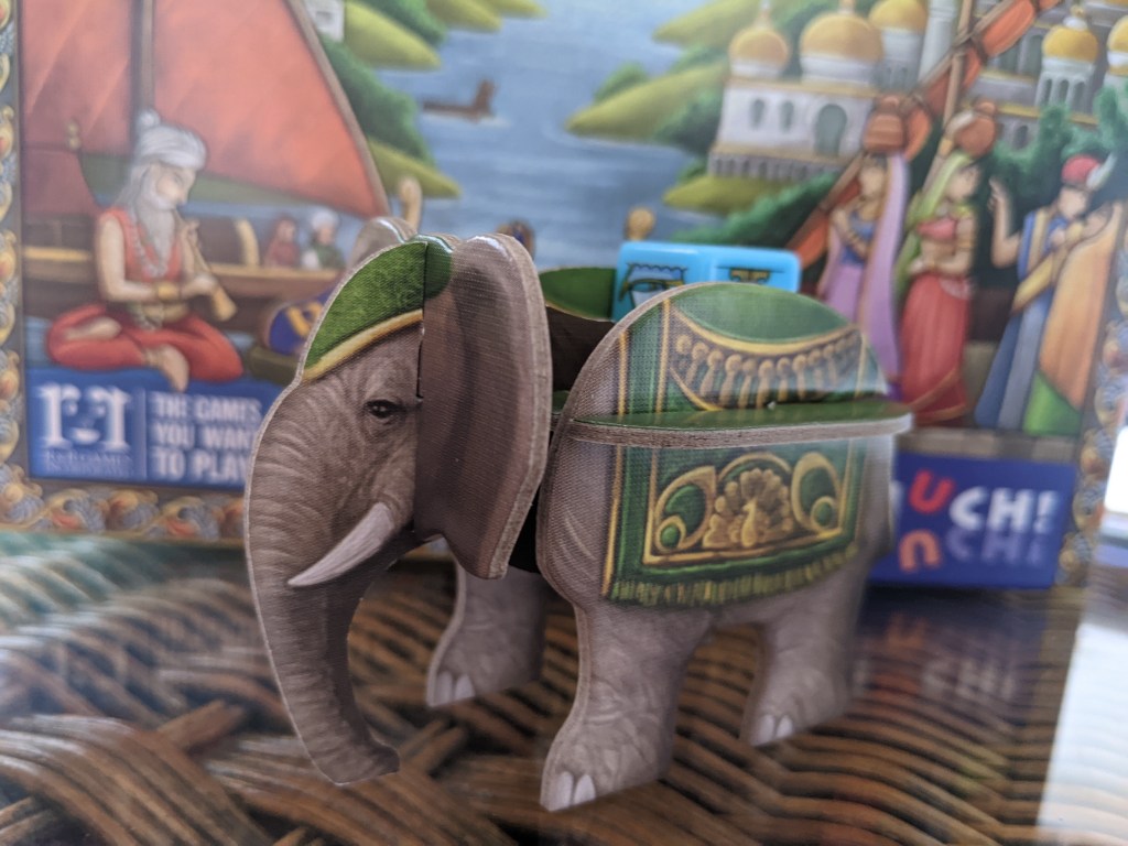 Rajas of the Ganges – The Dice Charmers kommt in einer mittelgroßen Schachtel daher, die denen der Kosmos 2-Personen-Spiel-Reihe ähnelt. Das Cover gleicht in weiten Teilen dem von Rajas of the Ganges nur ist im Allgemeinen das Farbschema des Spieles etwas angepasst worden und setzt nun mehr auf Pastelltöne als auf knallige Farben. In der Schachtel befinden sich 2 Spielblöcke mit jeweil ungefähr 50 Seiten (nicht genau nachgezählt), einer für die Sonnen- und einer für die Mondvariante. Positiv hervorzuheben ist meiner Meinung nach, dass die Blätter doppelseitig bedruckt sind, ökologisch sinnvoll, aber lange noch keine Selbstverständlichkeit. Desweiteren liegen dem Spielmaterial 8 pastellfarbene Würfel bei, 2 grüne, 2 gelbe, 2 lilafarbene und 2 blaue. Dabei repräsentiert jede Farbe eine bestimmte Kategorie von Aktionen, die auf dem entsprechenden Bereich des Spielplans ausgeführt werden können. Für jede Spielerin liegt eine Würfelablage bereit, die auch aufzeigt mit wievielen Würfeln pro Durchgang bei welcher Spielerinnenanzahl gespielt wird. Zuguterletzt darf natürlich auch ein Elefant nicht fehlen. Hier nicht als Startspielermarker, sondern als Ablage für gebannte Würfel. Dieser muss allerdings vor jeder Partie erst noch assembliert werden, da er zusammengebaut nicht in die Schachtel passt.