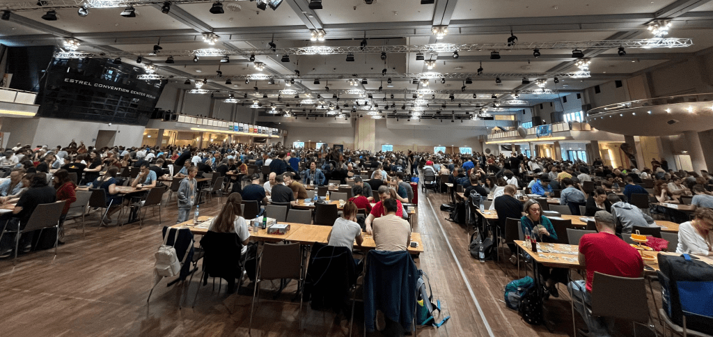 Vom 1. bis 3. August hieß es dieses Jahr wieder „Auf nach Berlin!“, um genauer zu sein, ins Estrel Hotel, ein Hotel der Superlative mit über 2000 Betten [1]. Nach der Anreise ging es erstmal mit unseren Spielen bepackt, zur Spieleannahme des berühmt berüchtigten Brettspielflohmarkts, an welcher sich schon eine kleine Schlange bildete. Doch dank des engagierten Flohmarktteams war die Schlange schnell abgearbeitet und wir konnten los zur Game Night. Diese fand am Freitag von 16:30 bis 24:00 statt und war für Besitzerinnen des sogenannten „Badge-Tickets“ inklusive.
